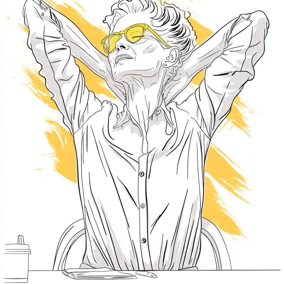 Image: Woman stretching at her desk, tuning into her body's signals with curious awareness and refreshing honesty.