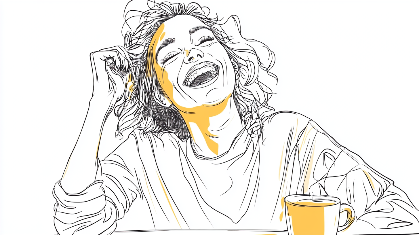 Image: A woman laughs over coffee, surprised at the sound of her own unexpected joy.